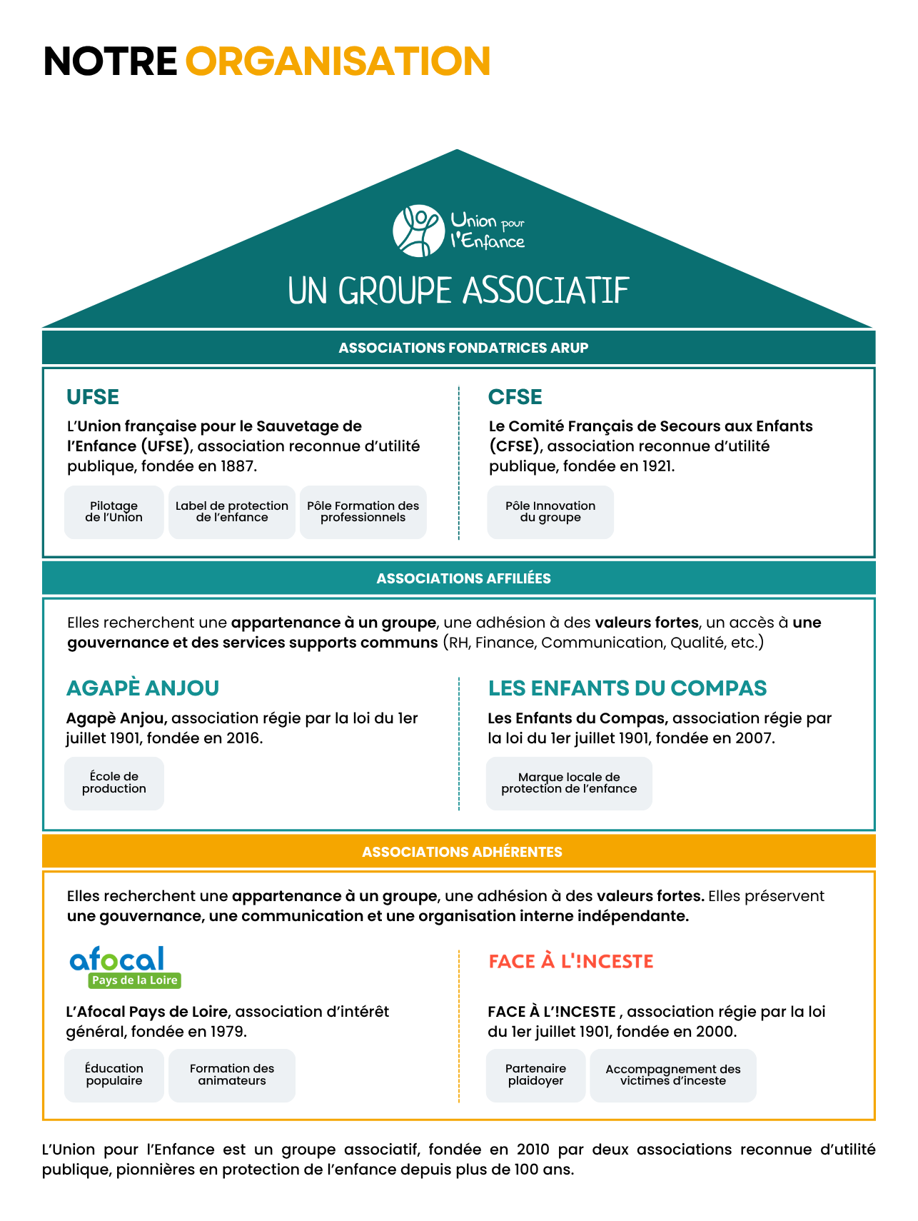 Depuis 2010, l’Union pour l’Enfance est devenu un groupement associatif dédié à la protection de l’enfance. Sa gouvernance est assurée par les Conseils d’Administration bénévoles de ses deux associations fondatrices :